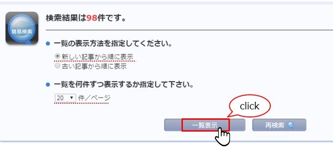 「表示方法」と「件数」を指定し、「一覧表示」をクリック。
