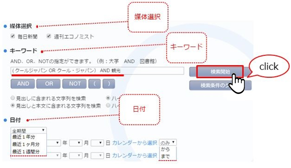 媒体選択:検索対象『毎日新聞』と『週刊エコノミスト』をチェックで選択します。