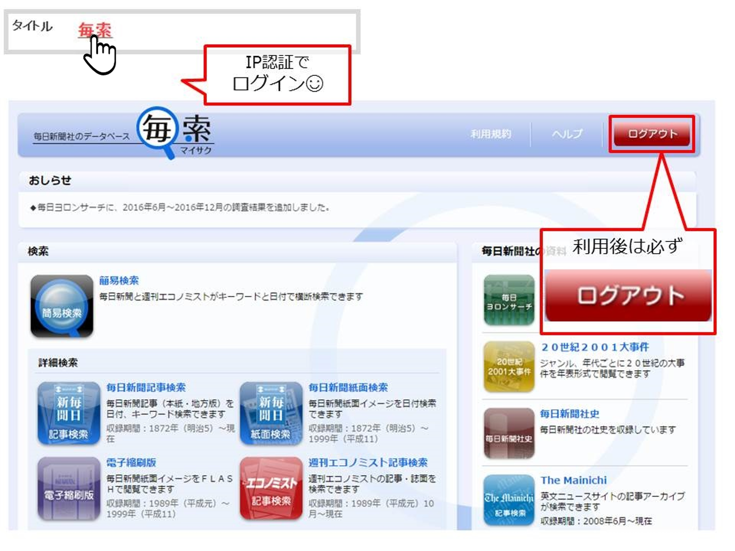直接のリンクはこちらから>> データベースポータル「毎索」
