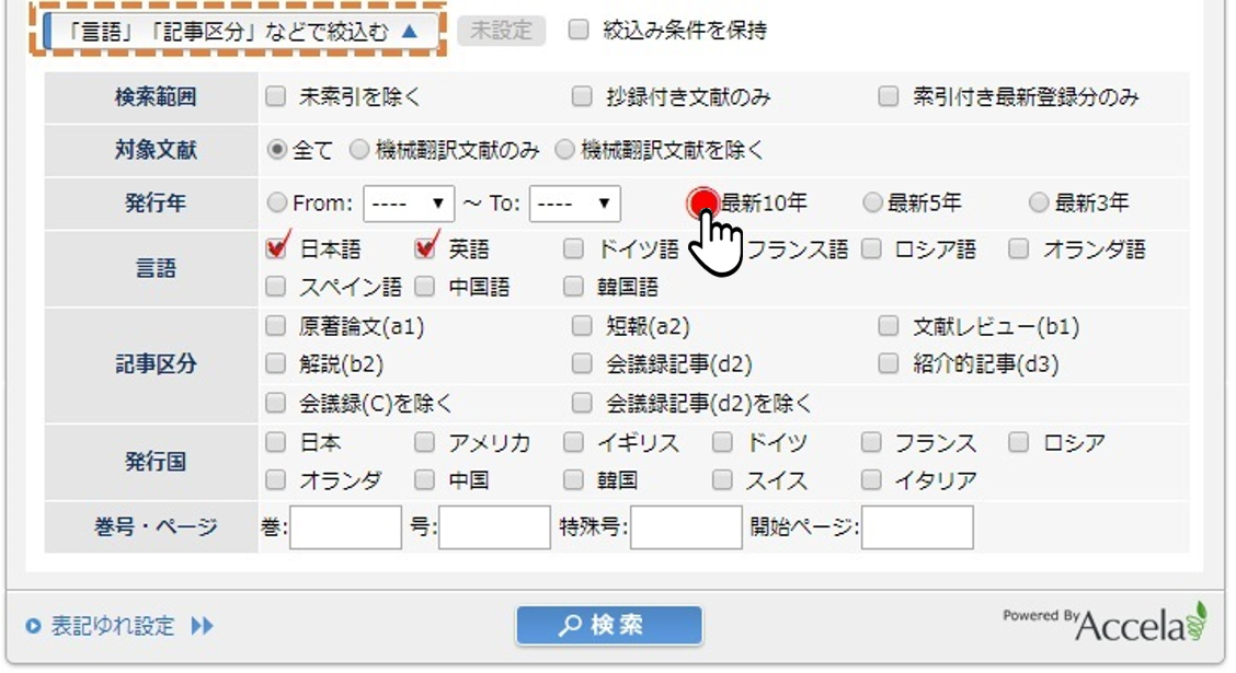 3.必要であれば「言語」「記事区分」といった絞り込み条件を設定する。