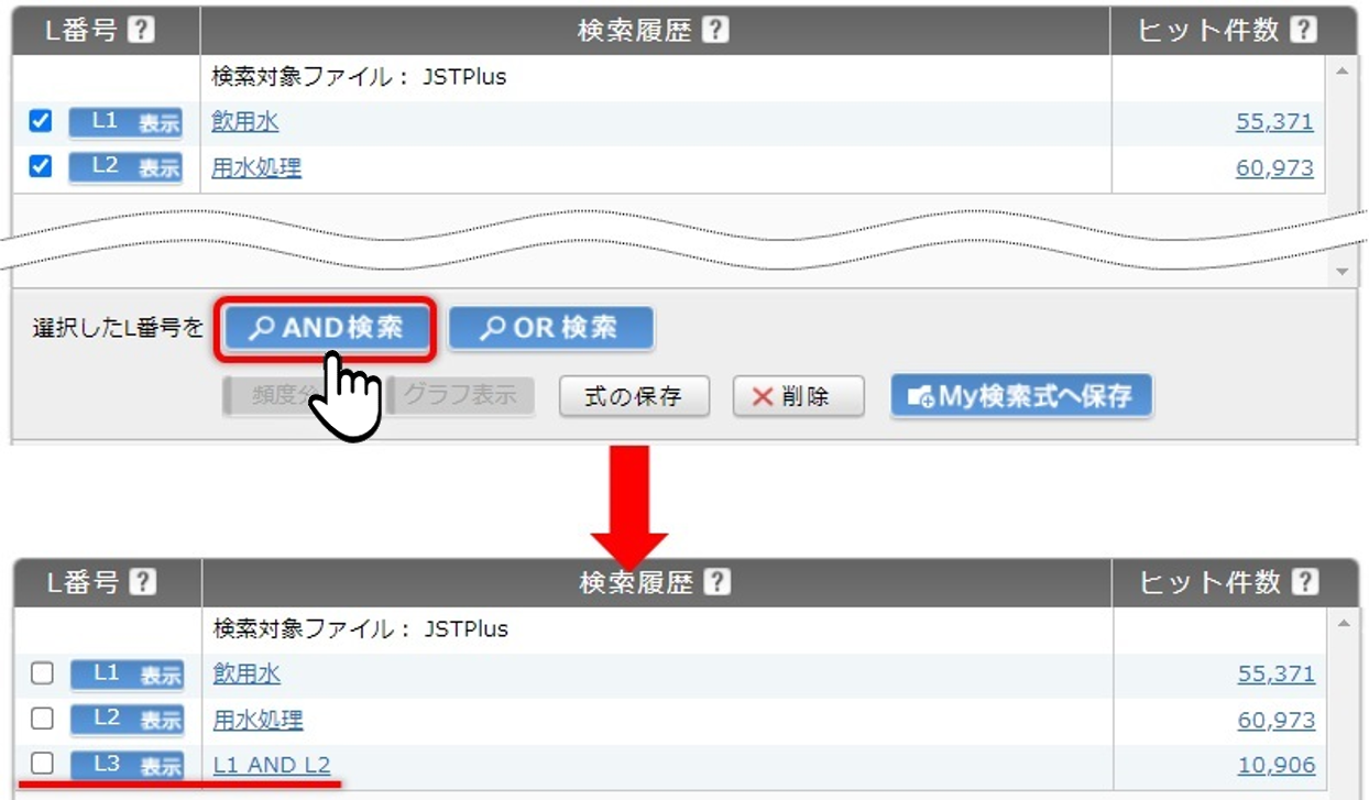 掛け合わせたい検索結果のL番号にチェックを入れ、「AND検索」もしくは「OR検索」を選択します。