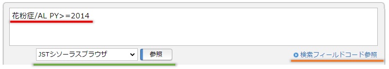 フィールドコードは、入力ボックス下の「検索フィールドコード参照」から一覧が参照できます。複数の検索語を、論理演算子を使って組み合わせることも可能です。
