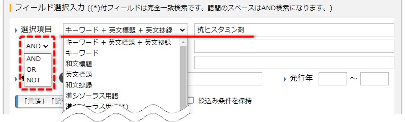 検索語の組み合わせ方(論理演算子)をプルダウンメニューで選択できます。