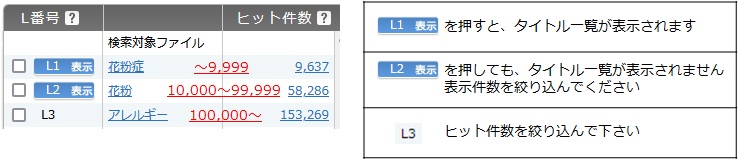お答えします。 同様にヒット件数が10,000件を超えた場合、L番号は表示されますが検索結果一覧からタイトルを全て確認することはできません。 |