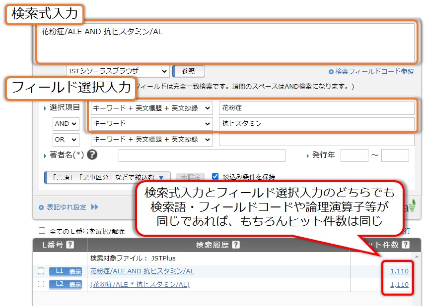このように、どちらの入力方式にもメリット・デメリットがあります。なお、検索式入力とフィールド選択入力のどちらを使っても、検索語・フィールドコードや論理演算式等が同じであれば、ヒット件数は同じです。そのため、色々試してみて自分の使いやすい入力方法を選んで下さい。 |