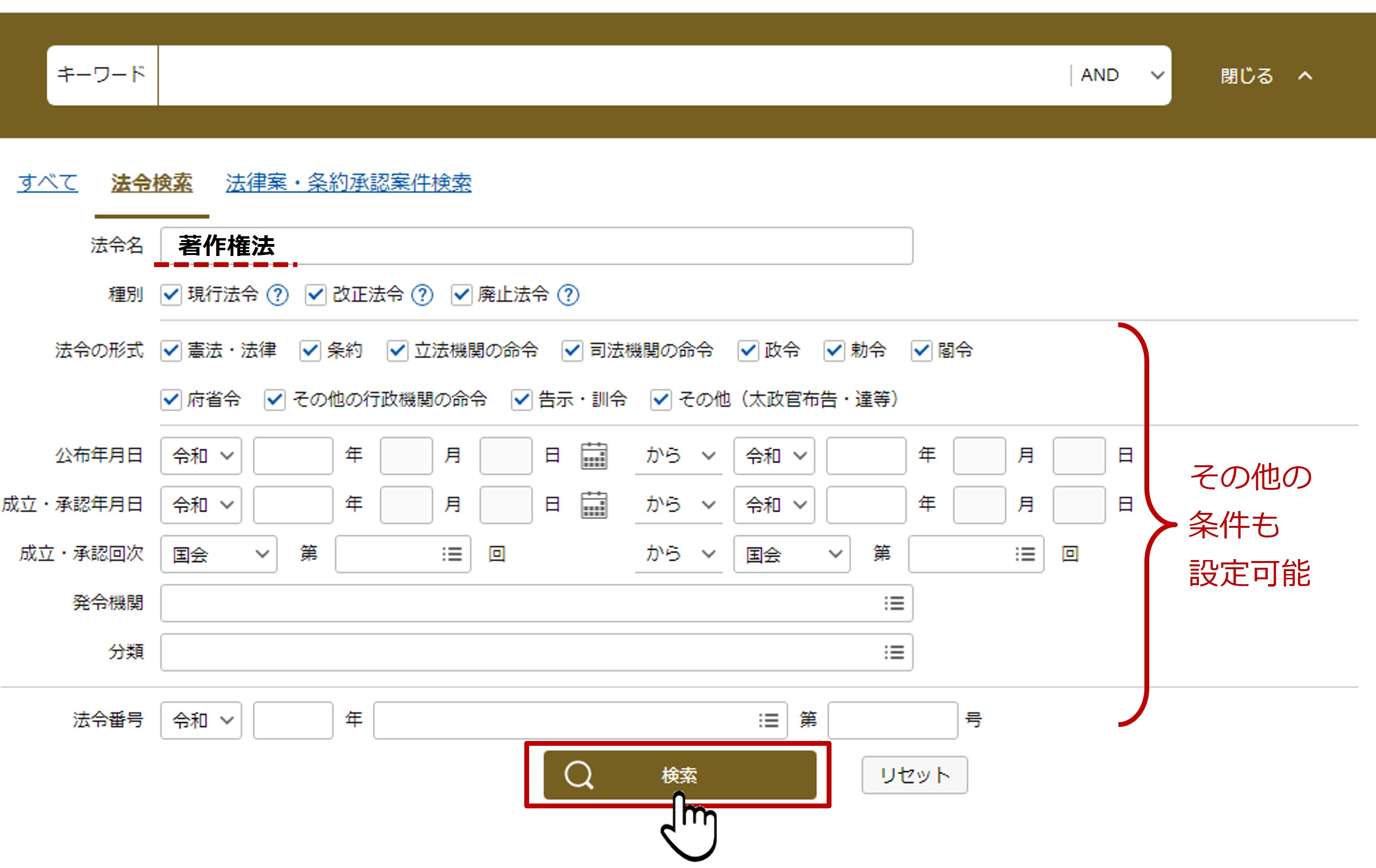 探したい法令が現行のものか廃止されたものか、それともそのための法令(改正法令)か… 等、他にも条件が設定できます。