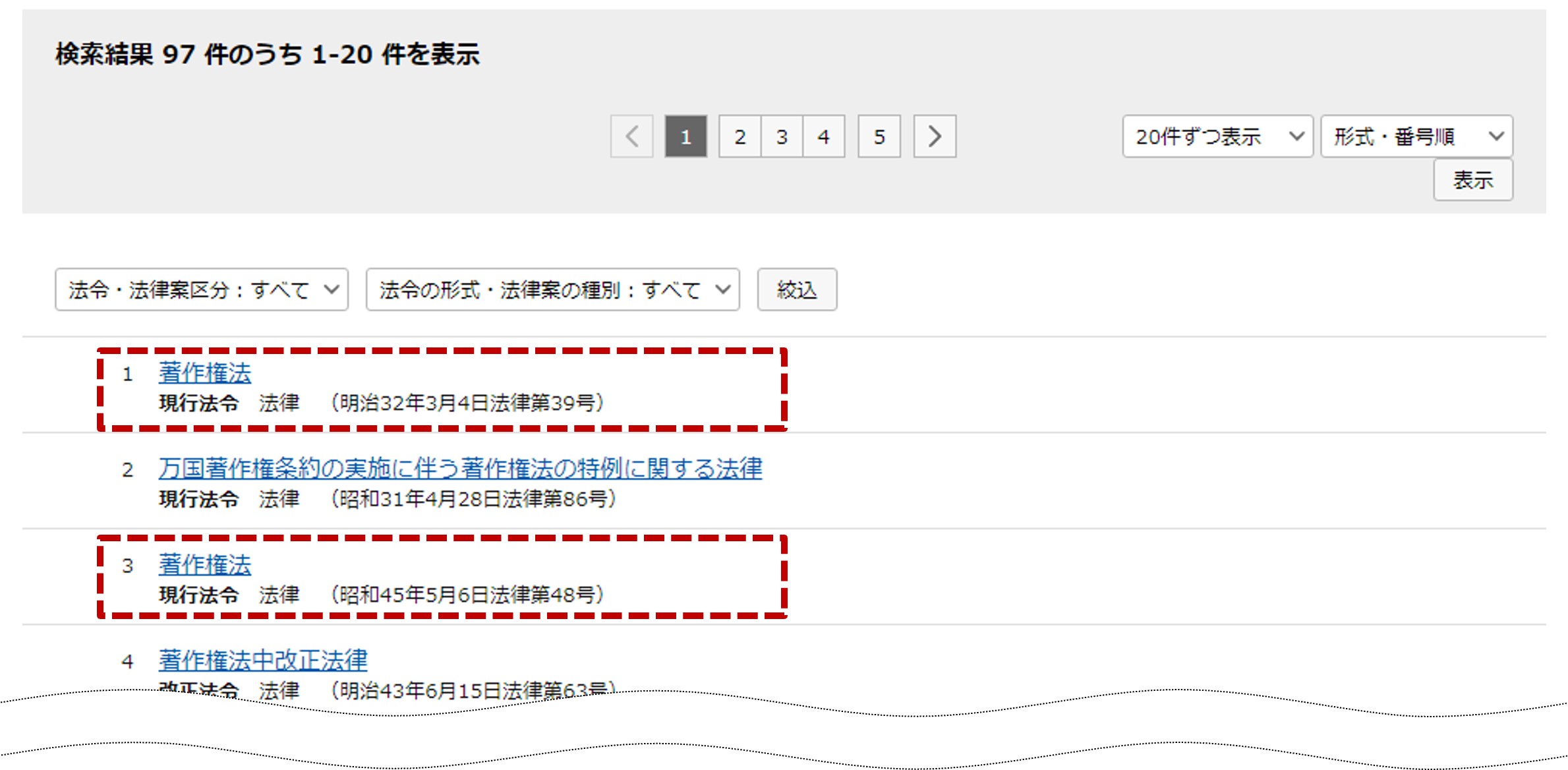 「著作権法」がふたつあります。これは「現行の法令だけれども、いちど全部改正されたことがある」ことを示しています。