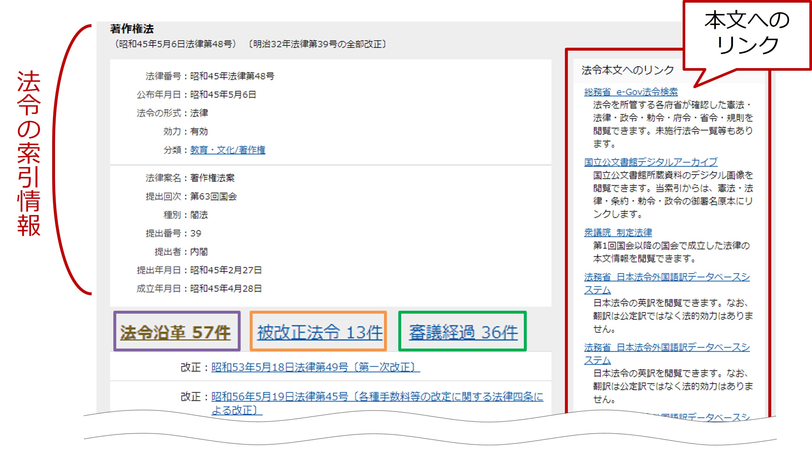 法令、法案、条約やそれらの索引情報など、すべてを対象に「キーワード検索」ができます。