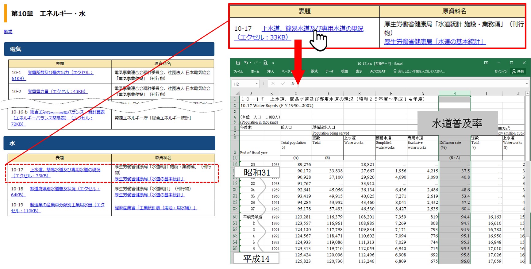 引き続き「水」の項を参照すると、昭和31年からの水道普及率の推移データが取得できました。