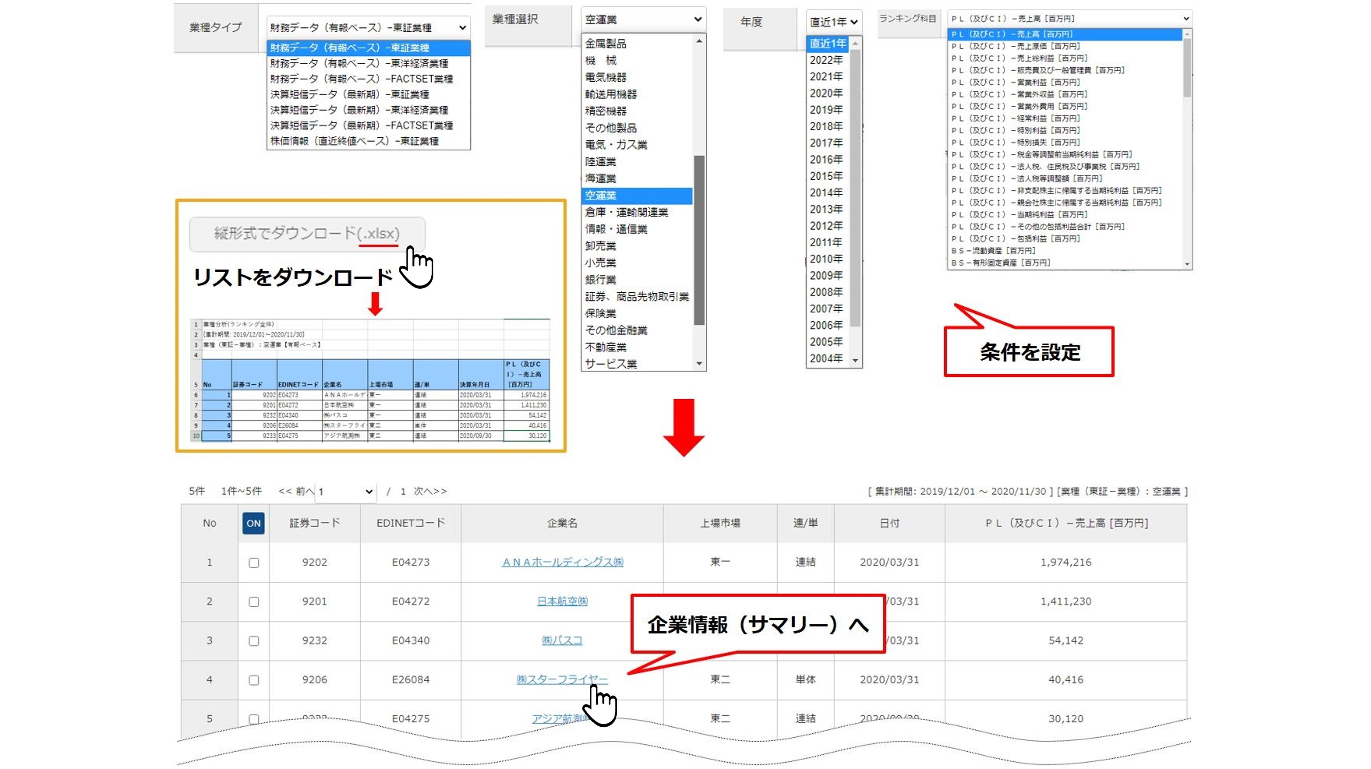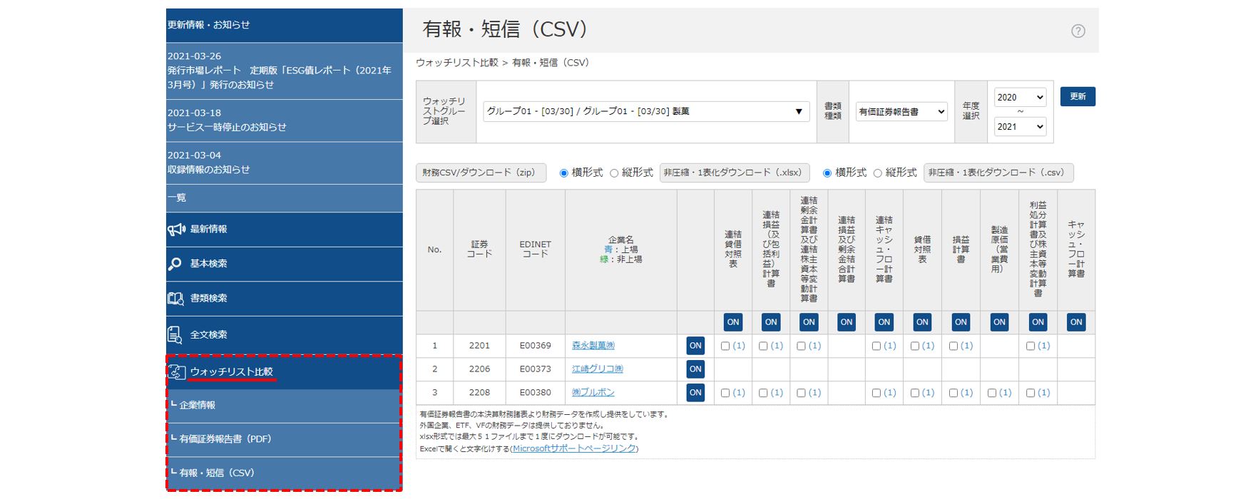 注目する企業をあらかじめリストに登録するシステムです。企業情報をワンクリックで表示したり、複数企業を比較表示したりすることができます。