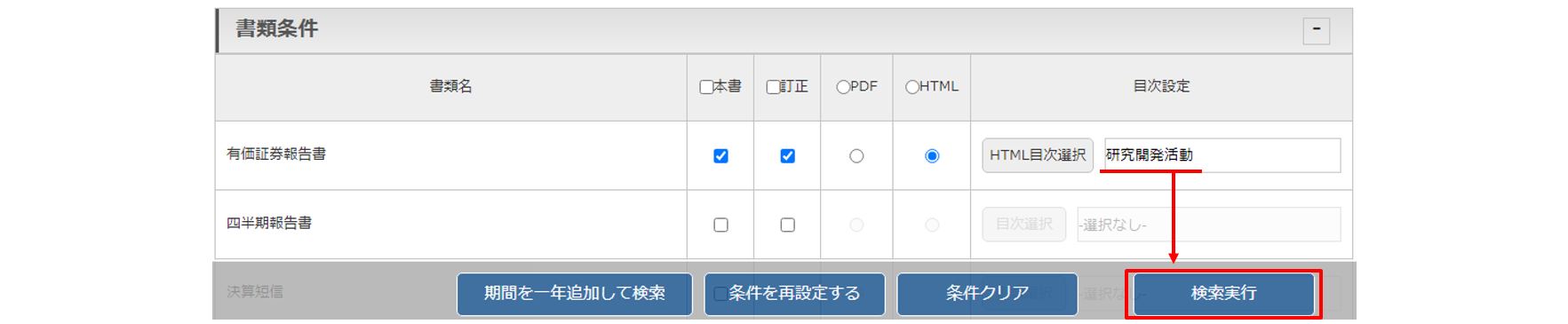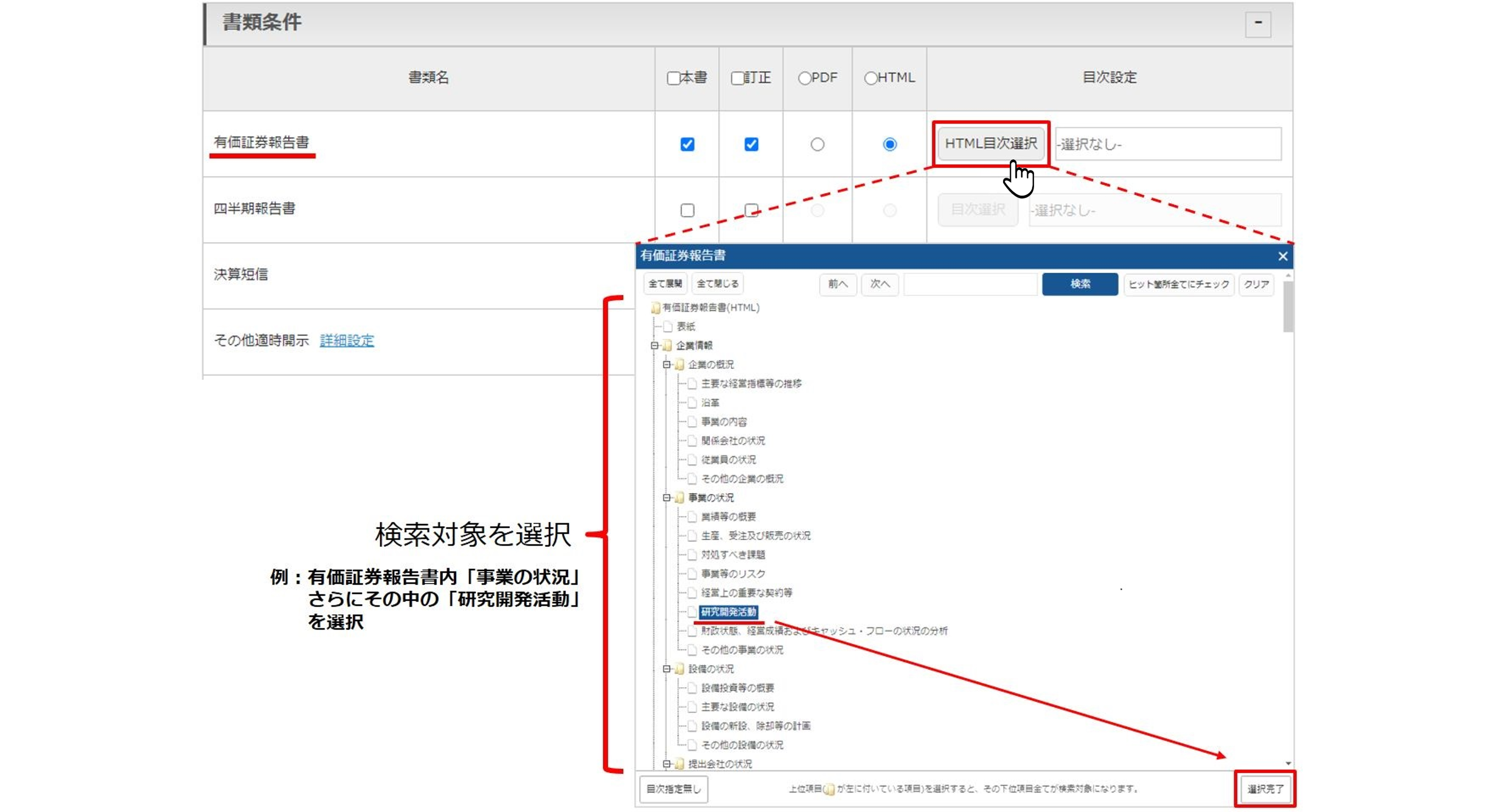 ② 書類は「有価証券報告書」を選択 → 【HTML目次選択】をクリックで検索対象を選択→ 【選択完了】クリック