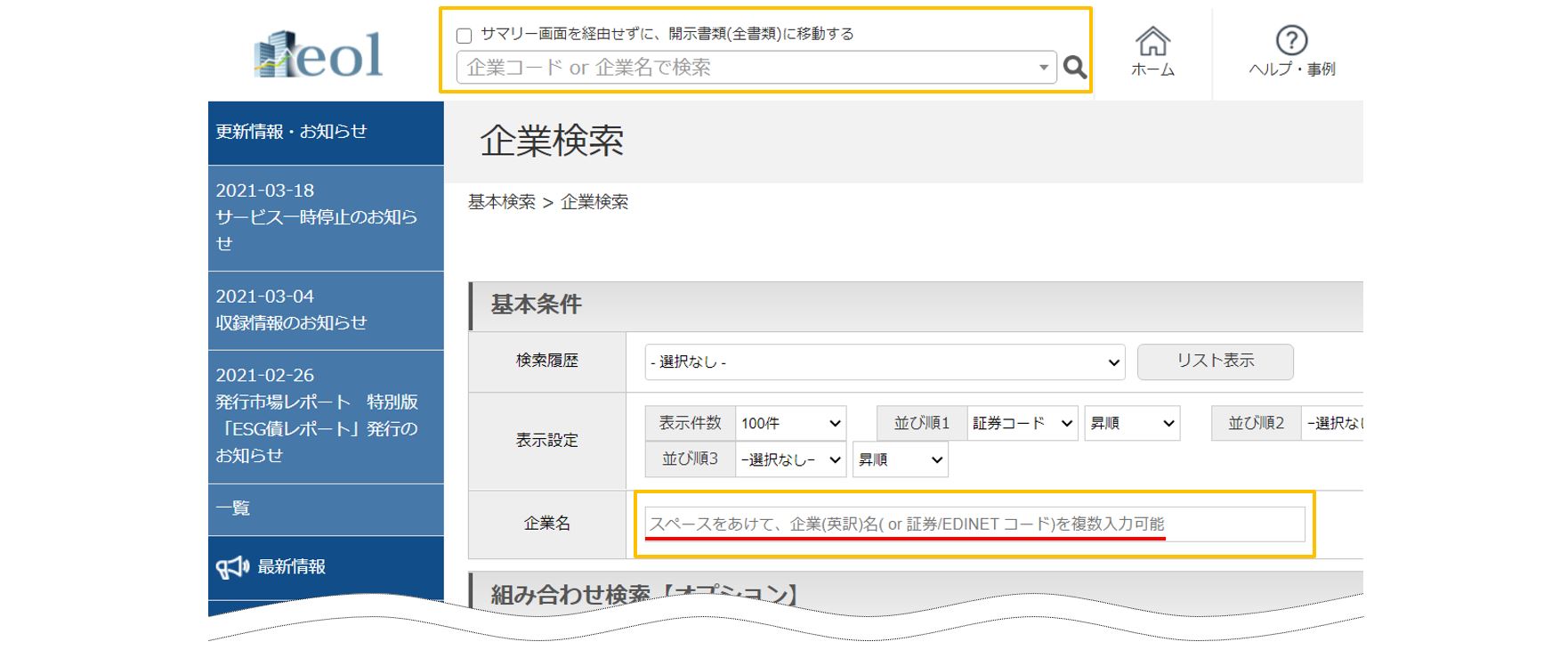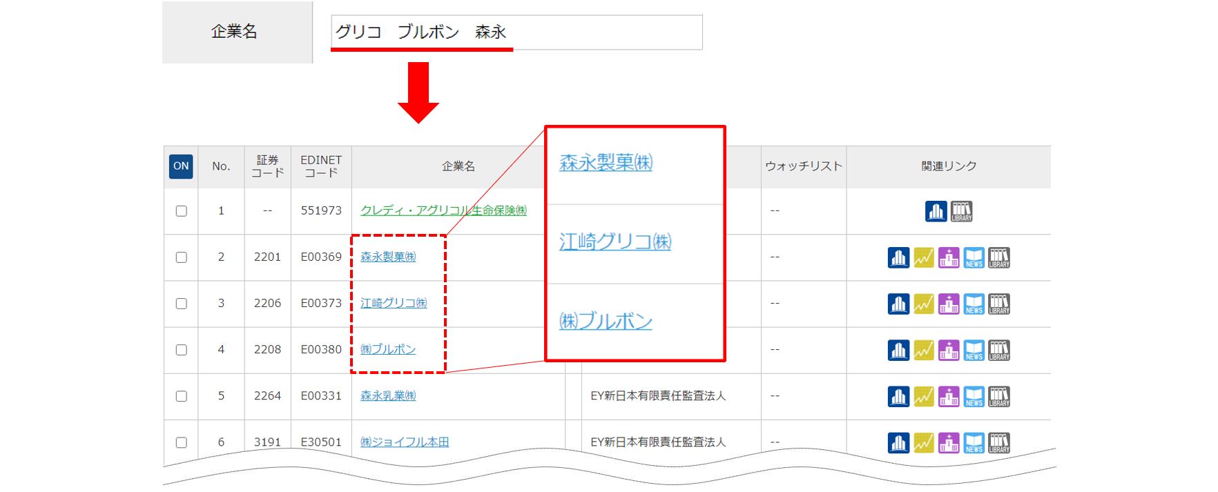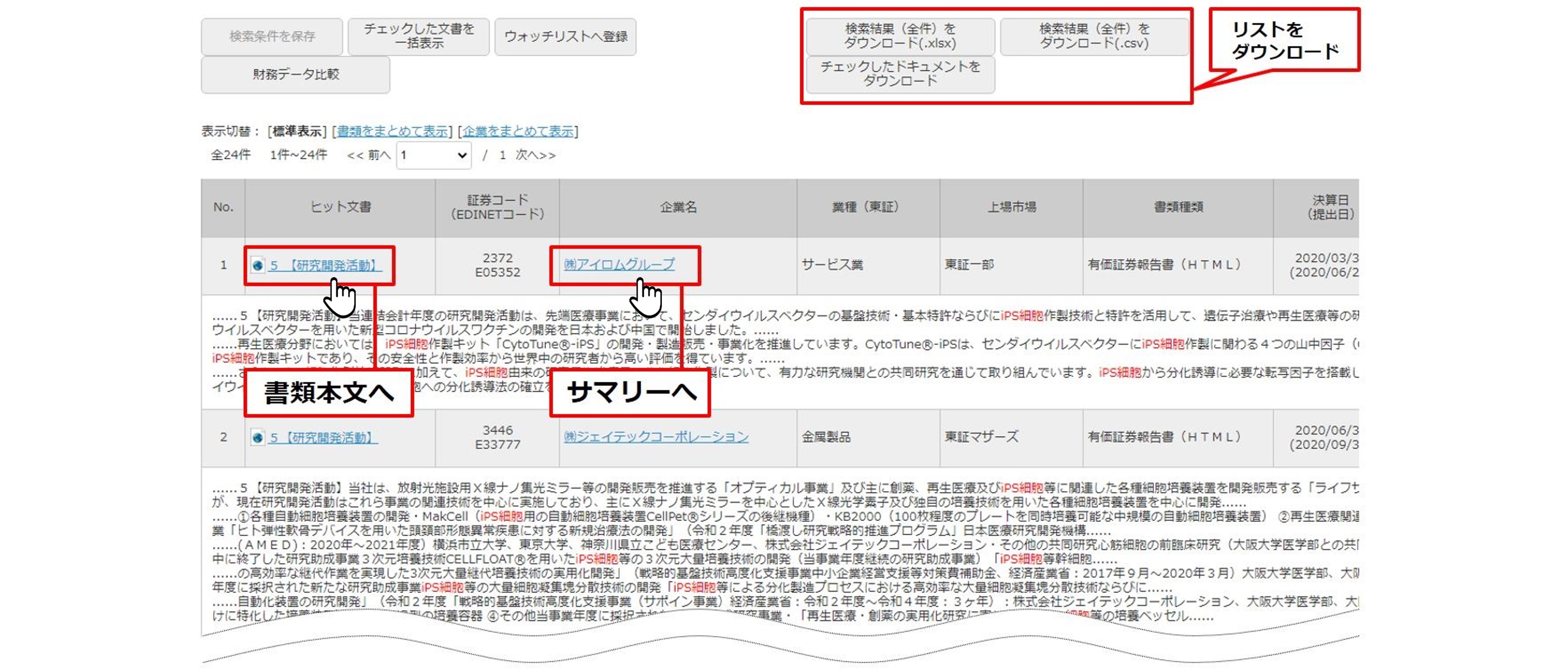 結果一覧からは、書類の掲載箇所本文はもちろん、企業情報へもリンクが張られています。