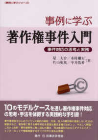 事例に学ぶ著作権事件入門 : 事件対応の思考と実務/星大介 [ほか] 著. -- 民事法研究会, 2023.