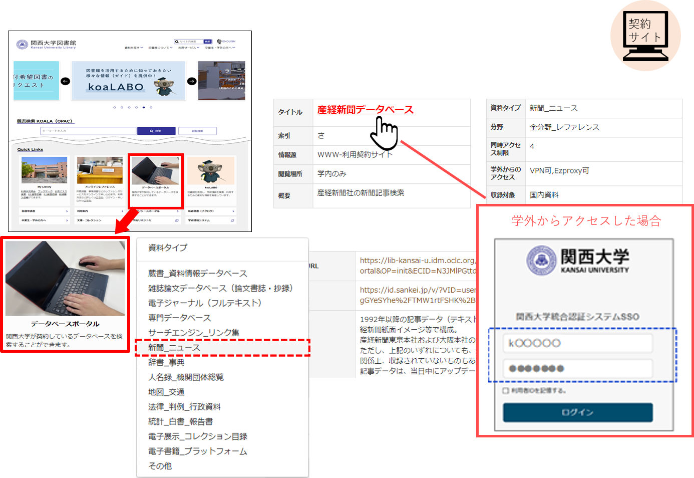 詳細はガイド「学外からデータベースを利用するには」を参照してください。