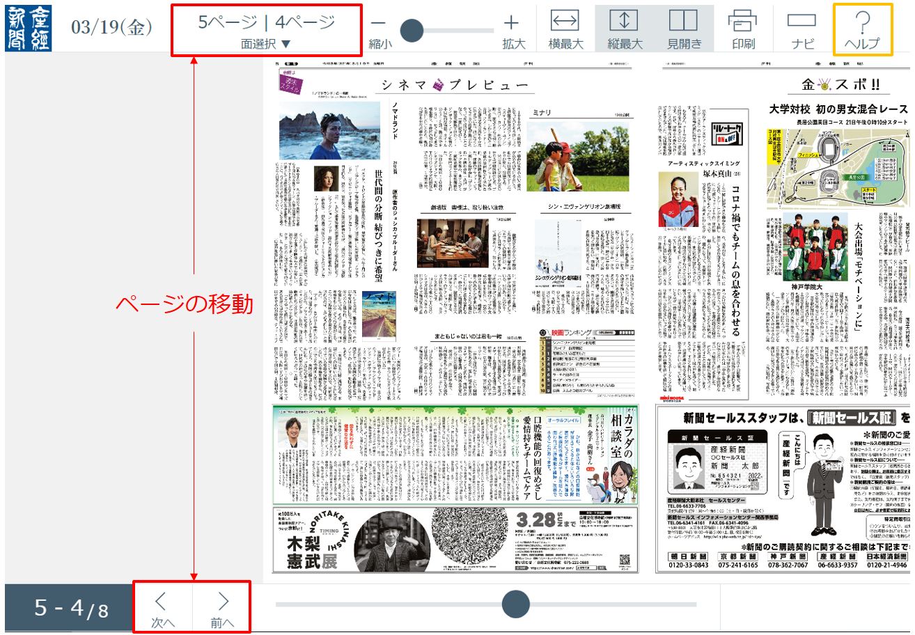 下部「次へ」「前へ」を押して1面ずつ紙面をめくることができます。