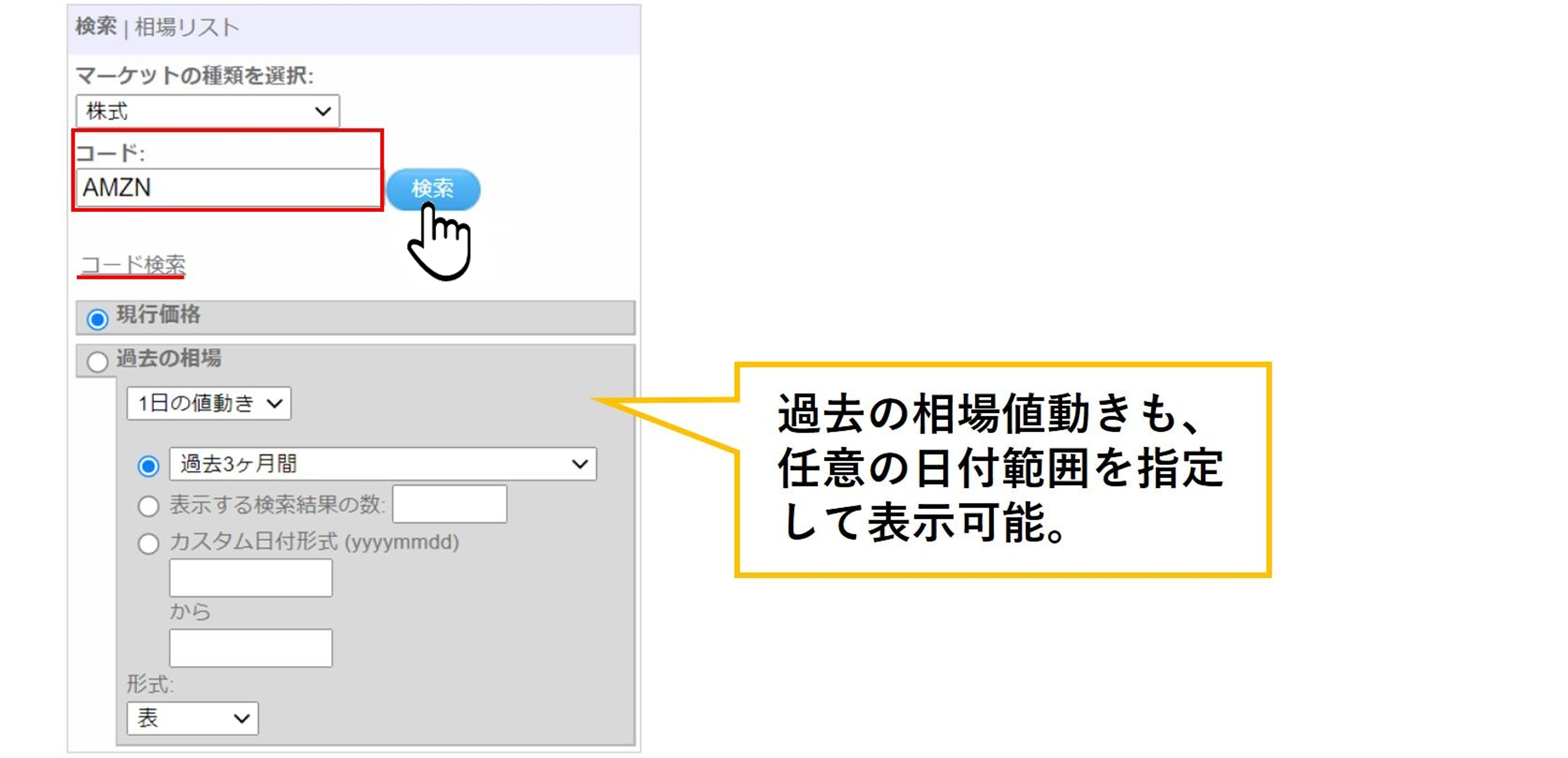 株式・投資信託・為替・株価指数など、様々な金融情報の現在の数値、過去の値動きを入手できます。