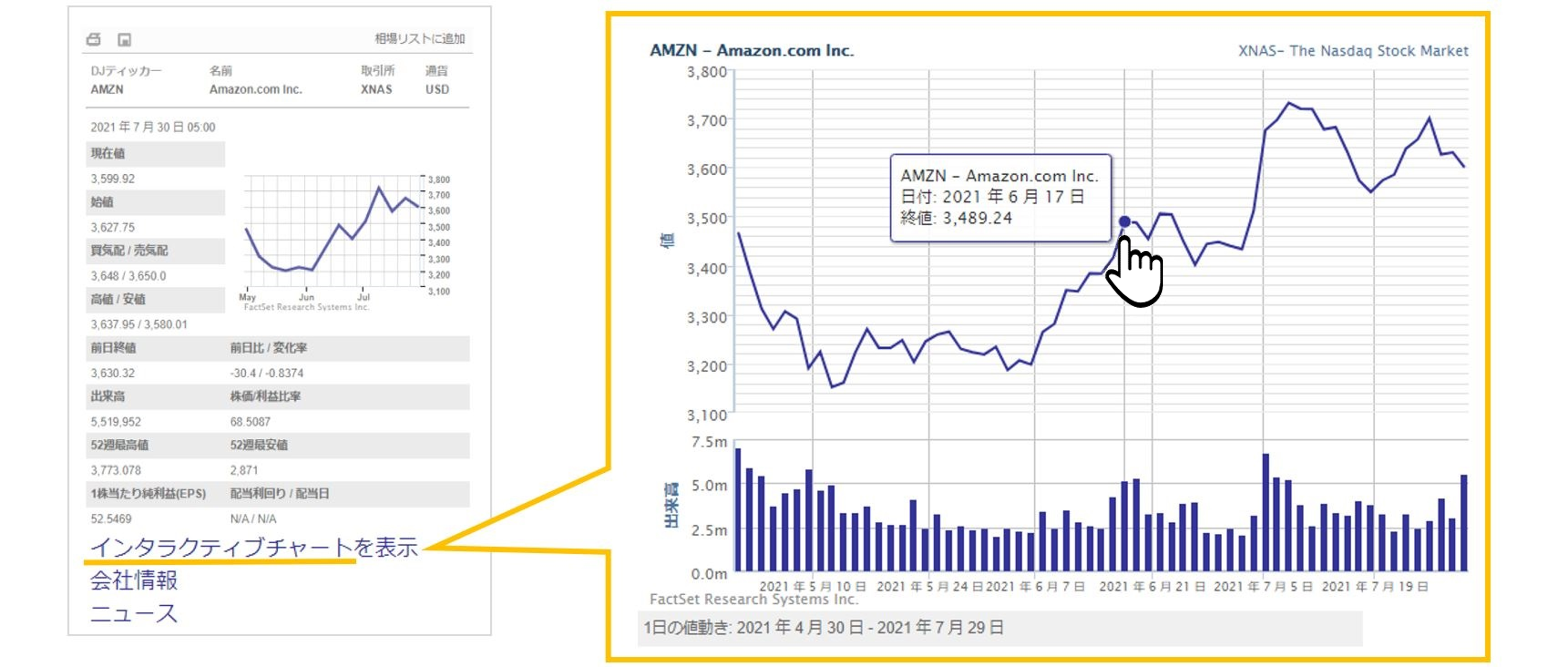 インタラクティブチャートでは、株価が上昇した点・下降した点にカーソルを合わせると、日付と終値が表示されます。