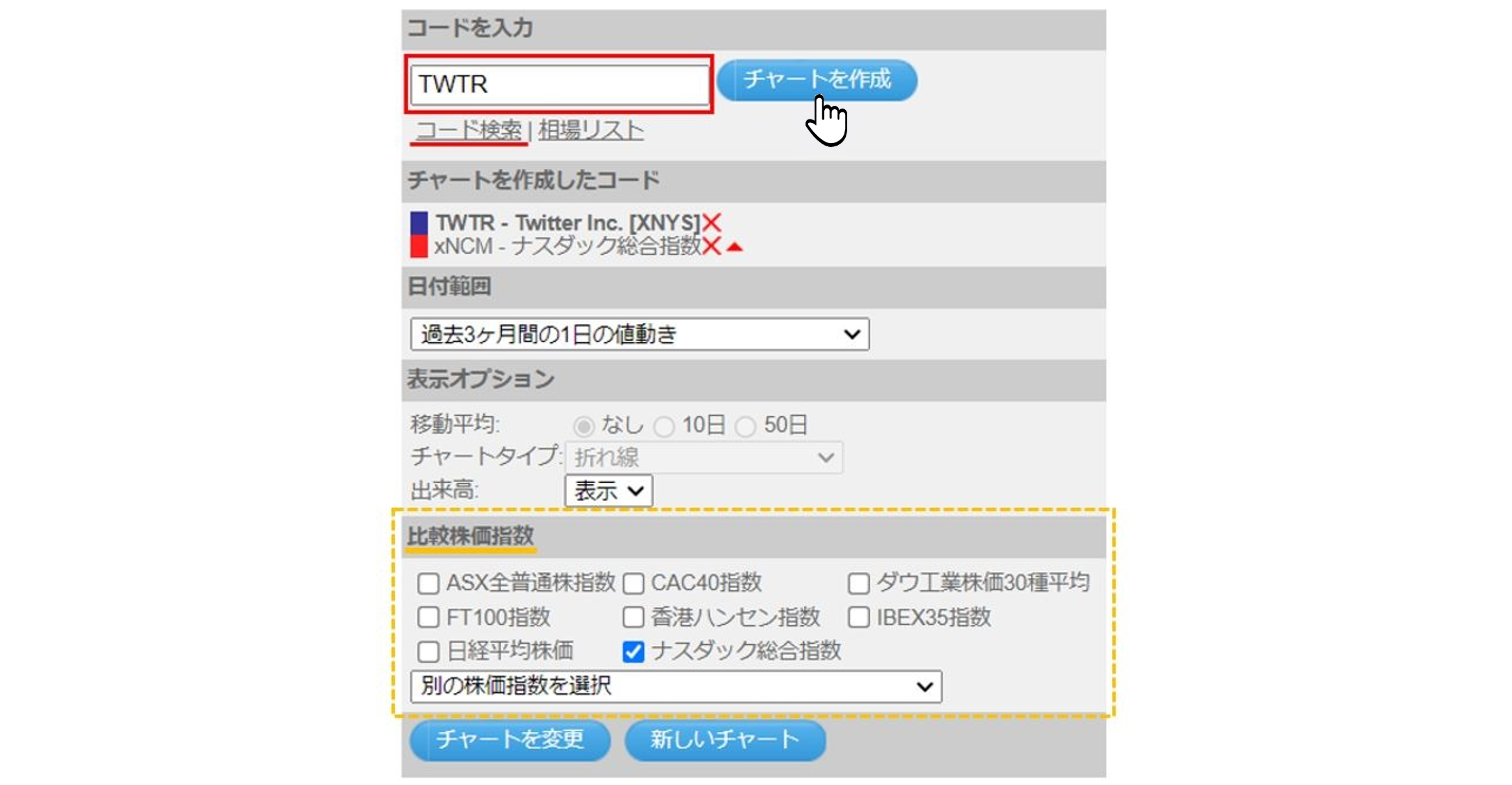 比較株価指数では、比較対照したい株価指数を任意に選択すれば、同じチャート上で表示できます。